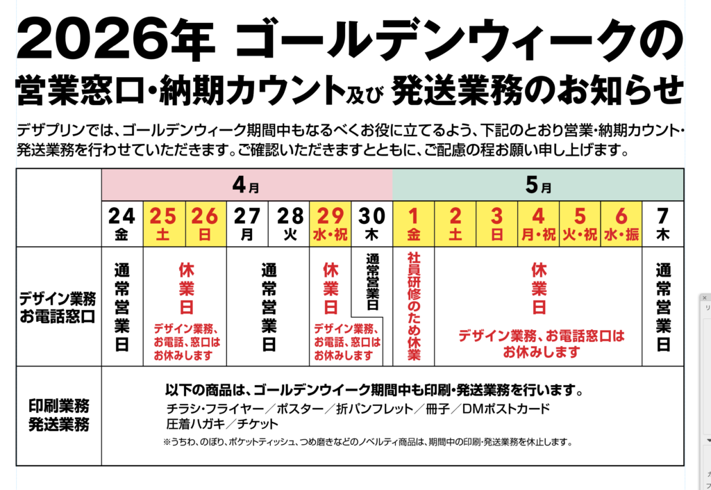 お知らせが遅くなりましたが、GW期間中の休業および業務スケジュールについて下記の通りとさせていただきます。